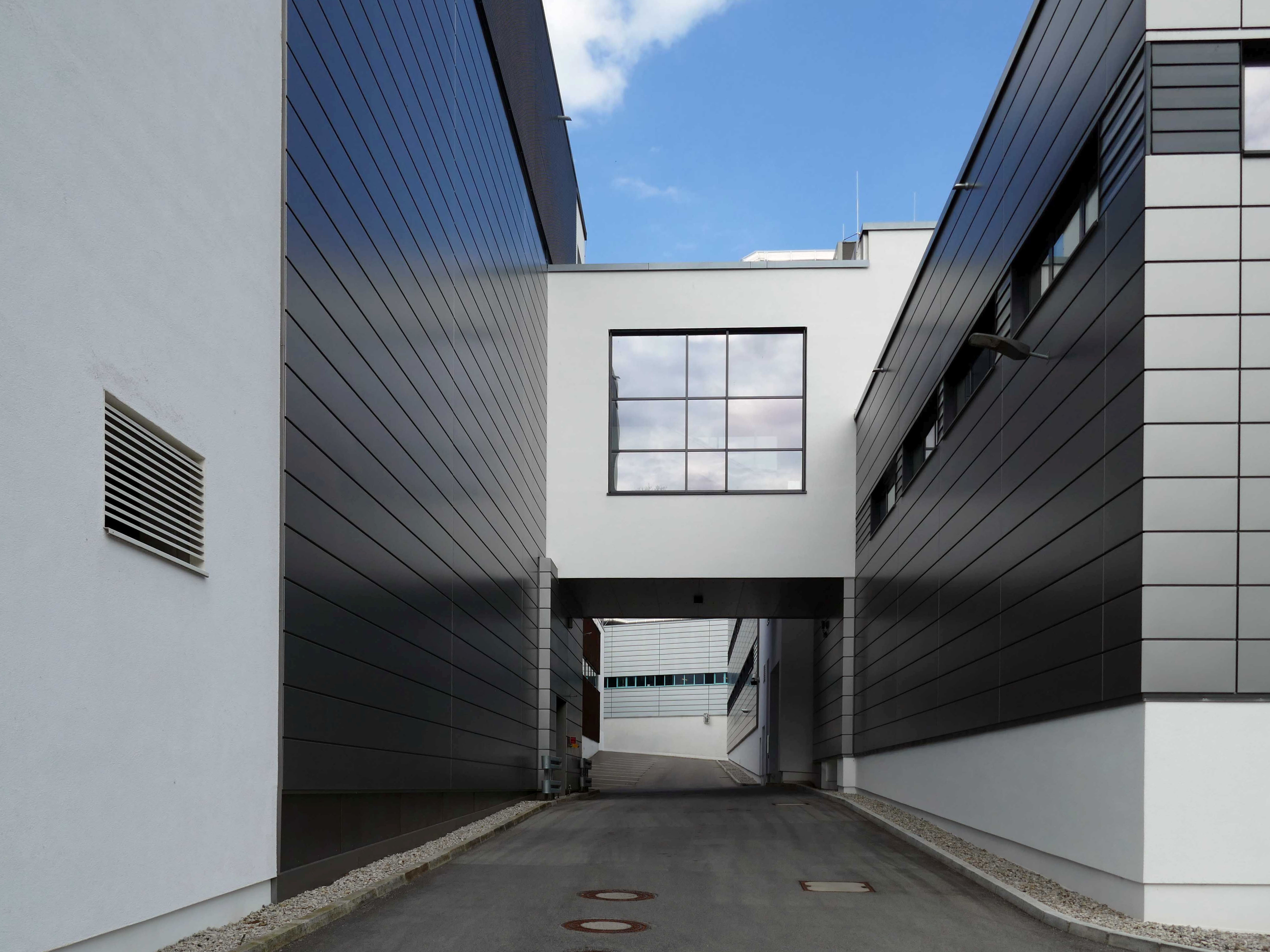 Die eingeschossige Erweiterung umfasst eine Fläche von 3.200 m² BGF. Es ist eine reine Fabrikationshalle und schließt ebenerdig an den Bestand an. Als weitere Maßnahme entstand eine Verbindungsbrücke zu Gebäude B5. ABH erbrachte die Objekt- und Generalplanung.