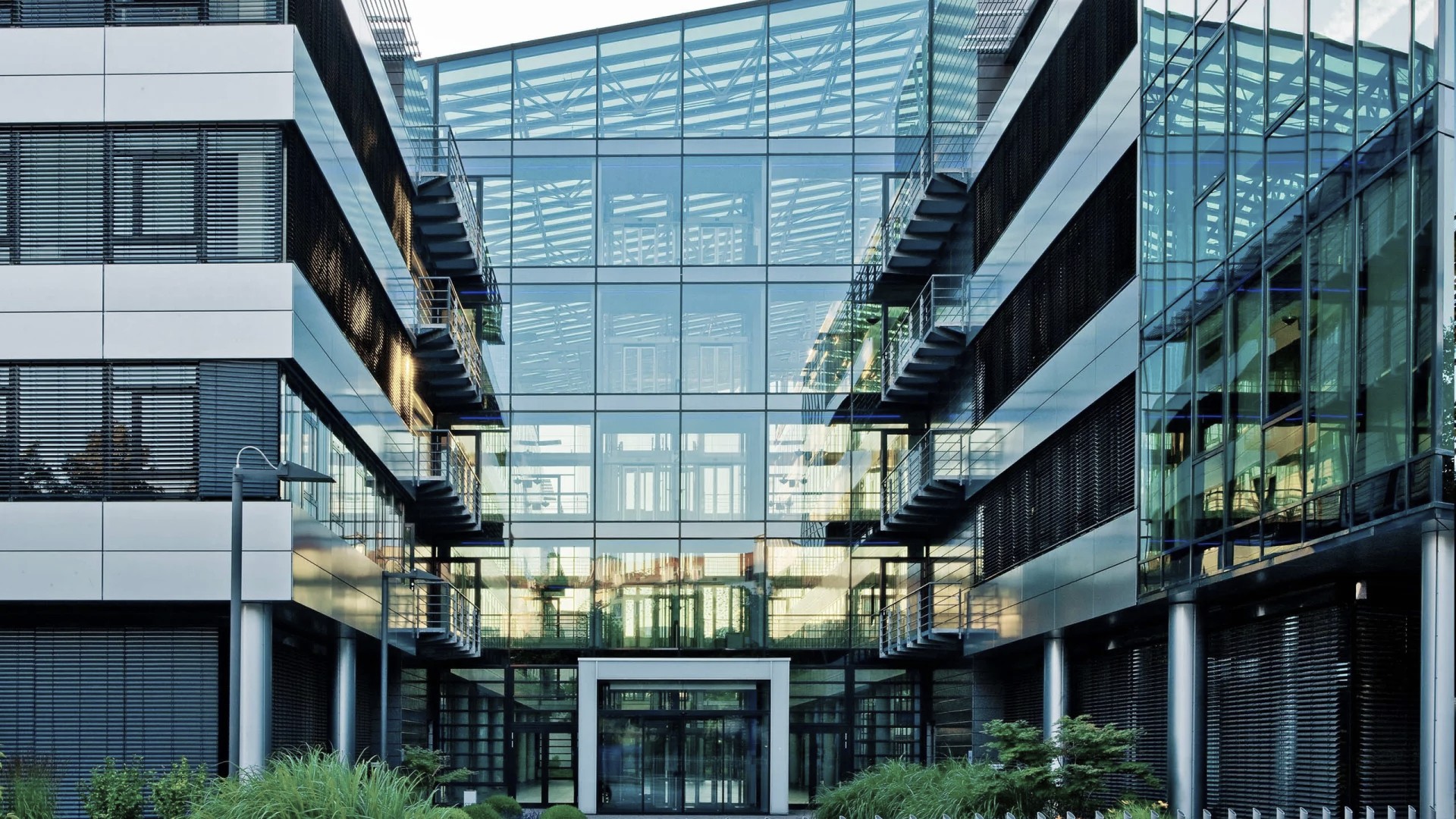 Das Gebäude bietet zahlreiche Büros, Schulungs- und Präsentationsräume sowie Cafeteria und Speisesaal. Zwei parallel angeordnete Gebäuderiegel sind durch ein verglastes Atrium miteinander verbunden. Transparente Galerien an beiden Enden des Atriums zwischen den beiden Riegeln erschließen den Baukörper, erhöhen die Qualität der Freiräume für eine vielfältigere Nutzung und tragen zu einem vielschichtigen, dynamischen Raumgefühl bei. Entlang der Außenfassade und der verglasten Flächen zum Atrium liegen die flexibel teilbaren Gruppenbüros. Die Belichtung und natürliche Belüftung der Büros erfolgt durch öffenbare Fenster sowohl an den Außenfassaden als auch über das Atrium.