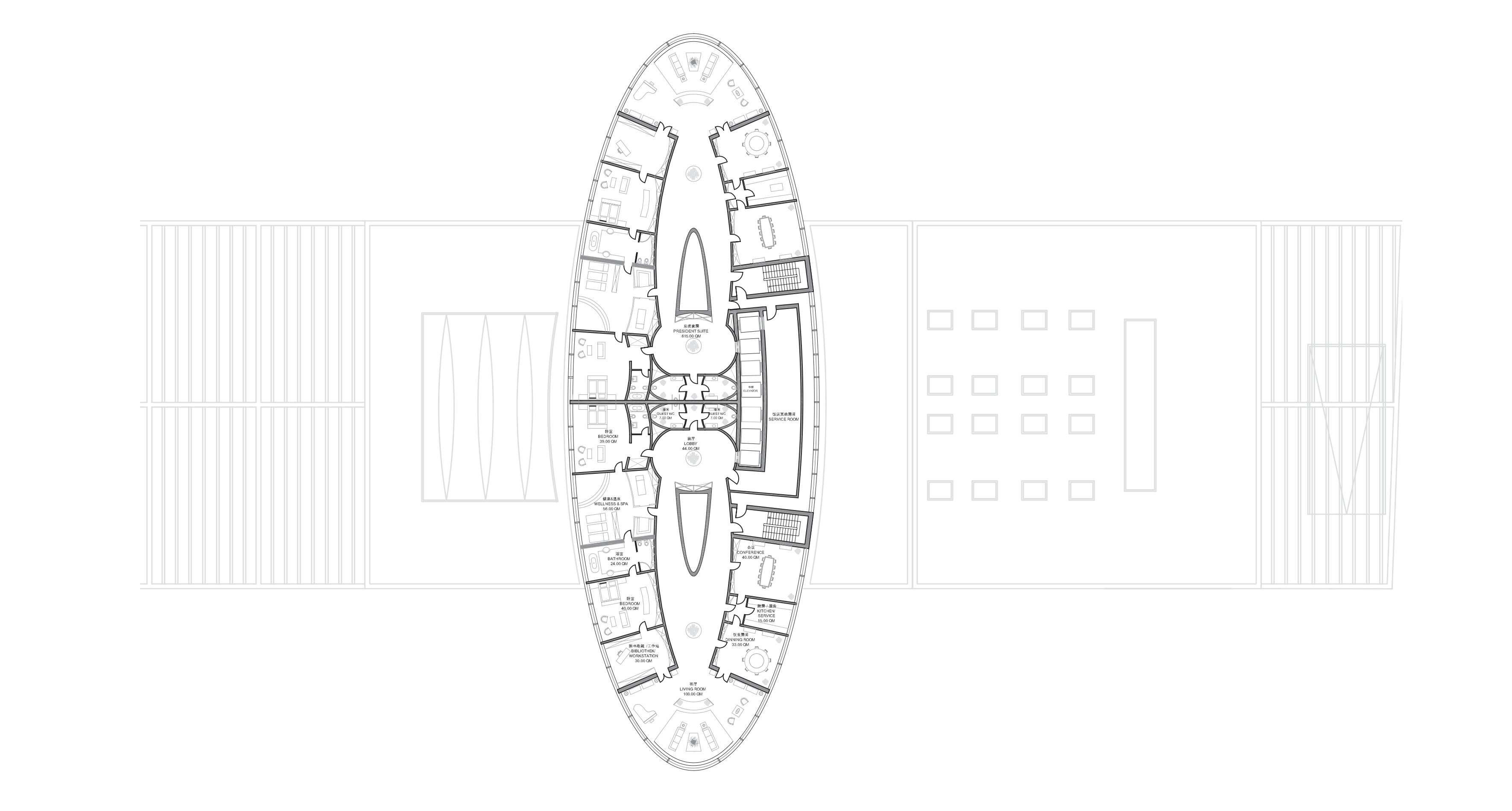 A horizontal, four-storey building houses a conference centre, hotel lobby, a spa with thermal bath and a roof terrace with gastronomy services. This structure serves as a base for the other 23 floors of the oval tower, which houses the hotel rooms, suites as well as another roof terrace with a bar. To the southwest, the property extends further into a park with an artificial lake. The individual garden villas are freely arranged in this green area.